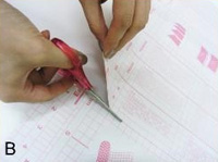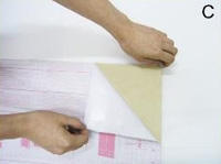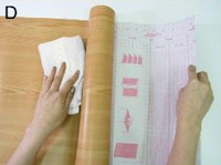 按表面大小並預留疊幅尺寸剪裁。若裱貼較大面積時,先將底紙擲離小許(約10cm)作定位黏貼,檢查位置無誤,再加壓?平,然後小心地逐步將底紙撕離,同時用手或布從中間向兩旁?去,以排除底部空氣•若貼後發覺尚有氣泡,可用針刺破,擠出空氣。裱貼時若發覺錯位有偏差,可即時小心將膠貼揭起重貼。膠貼之間疊幅應該不少於5mm•